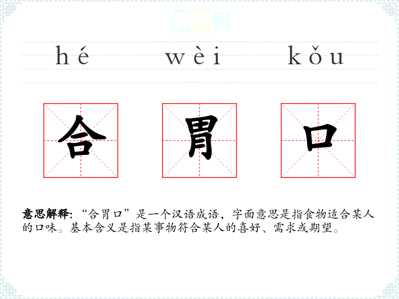 “合胃口”是一个汉语成语,字面意思是指食物适合某人的口味。基本含义是指某事物符合某人的喜好、需求或期望。