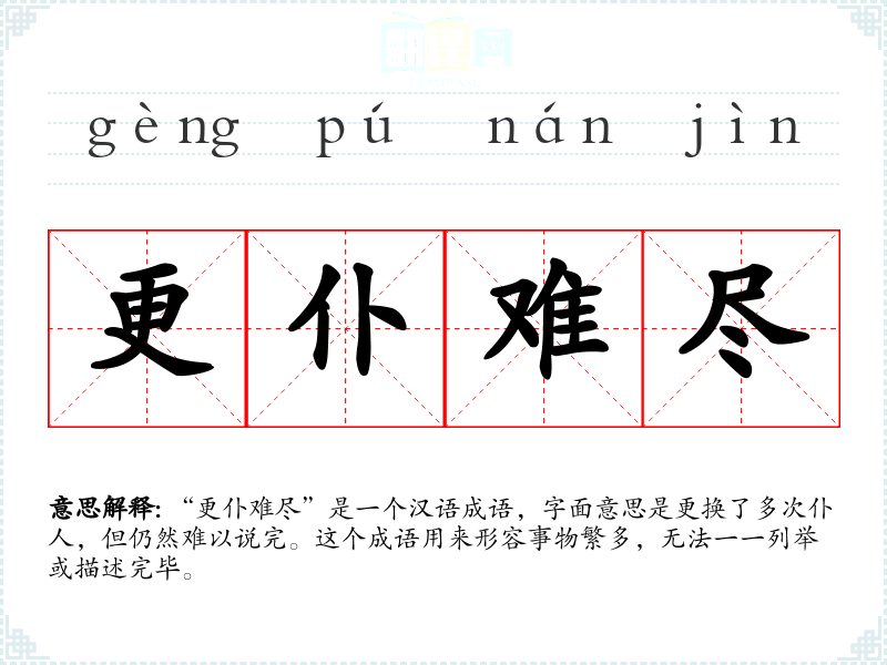 “更仆难尽”是一个汉语成语,字面意思是更换了多次仆人,但仍然难以说完。这个成语用来形容事物繁多,无法一一列举或描述完毕。