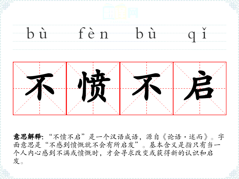 “不愤不启”是一个汉语成语,源自《论语·述而》。字面意思是“不感到愤慨就不会有所启发”。基本含义是指只有当一个人内心感到不满或愤慨时,才会寻求改变或获得新的认识和启发。