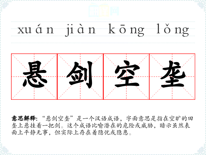 “悬剑空垄”是一个汉语成语,字面意思是指在空旷的田垄上悬挂着一把剑。这个成语比喻潜在的危险或威胁,暗示虽然表面上平静无事,但实际上存在着隐忧或隐患。