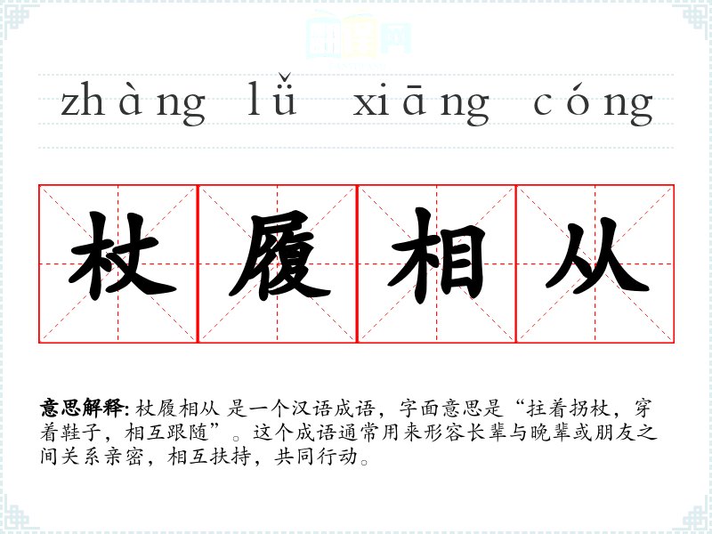 杖履相从 这个成语不仅是一个语言符号,更是一种文化传承和情感表达。它提醒我们在生活中珍惜与家人和朋友的关系,相互扶持,共同前行。在我的语言学*和表达中,理解和运用这样的成语能够丰富我的表达方式,增强语言的文化底蕴。