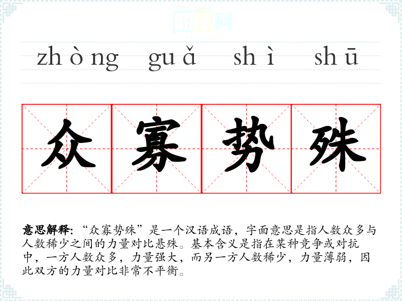 在**文化中,“众寡势殊”常常与“以少胜多”的观念相对应,强调在不利条件下依然能够取得胜利的智慧和勇气。这个成语在社会背景中常用来鼓励人们在逆境中坚持和奋斗。