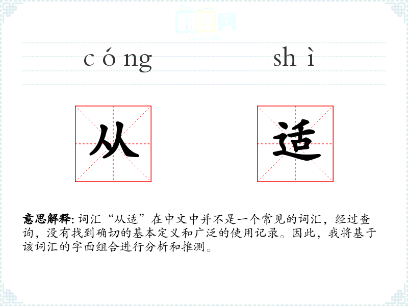 由于“从适”不是一个常用词汇,其词源和历史演变难以考证。它可能是由常用词汇“从”和“适”组合而成的新词,用以表达特定的意义。