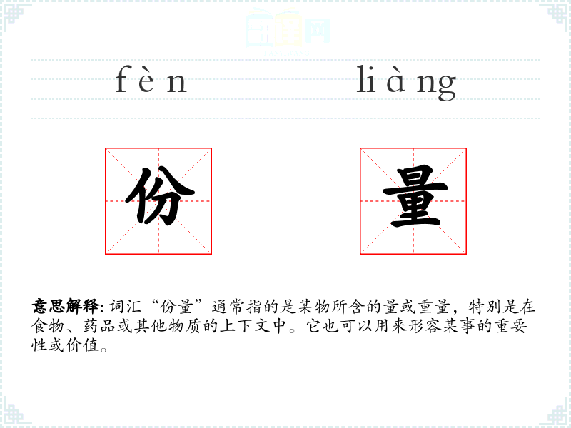 词汇“份量”通常指的是某物所含的量或重量,特别是在食物、药品或其他物质的上下文中。它也可以用来形容某事的重要性或价值。