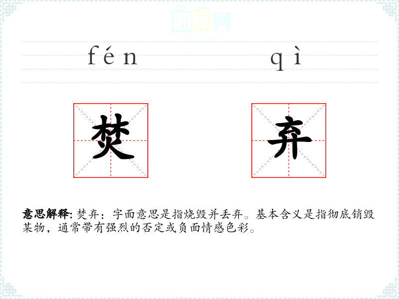 焚弃:字面意思是指烧毁并丢弃。基本含义是指彻底销毁某物,通常带有强烈的否定或负面情感色彩。