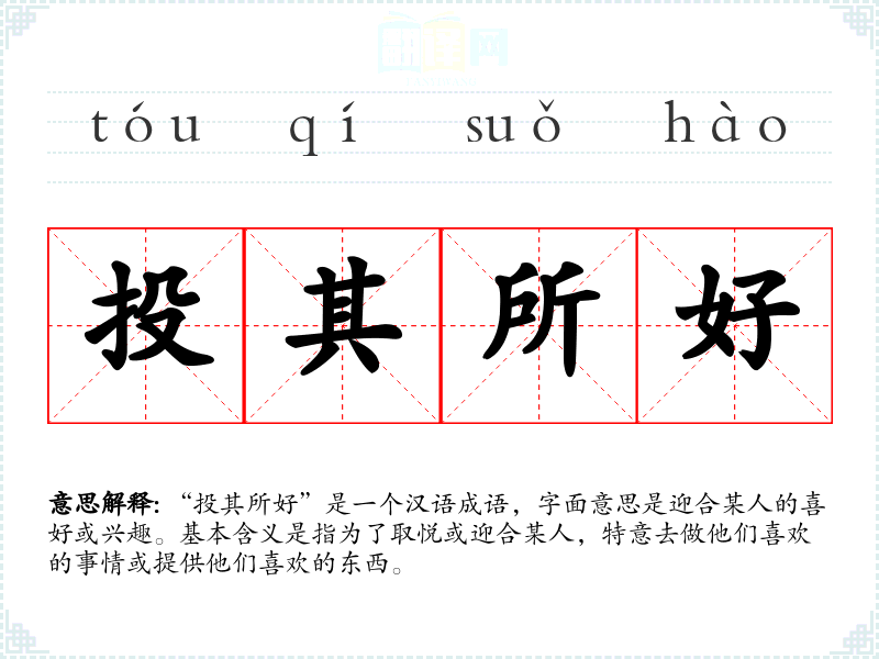 “投其所好”是一个汉语成语,字面意思是迎合某人的喜好或兴趣。基本含义是指为了取悦或迎合某人,特意去做他们喜欢的事情或提供他们喜欢的东西。