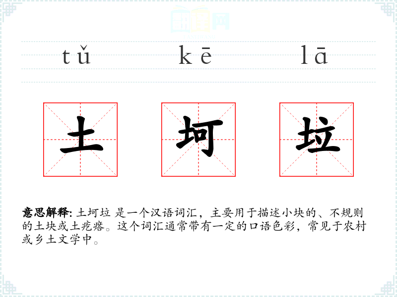 土坷垃 是一个汉语词汇,主要用于描述小块的、不规则的土块或土疙瘩。这个词汇通常带有一定的口语色彩,常见于农村或乡土文学中。