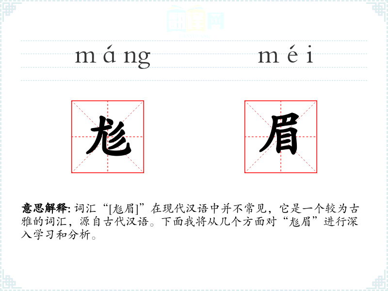 “尨”字在古代汉语中有杂乱、不整齐的意思,“眉”即眉毛。这个词汇可能起源于对老年人特征的描述,随着时间的推移,其使用频率逐渐降低,成为了一个较为生僻的词汇。