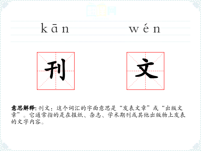 刊文:这个词汇的字面意思是“发表文章”或“出版文章”。它通常指的是在报纸、杂志、学术期刊或其他出版物上发表的文字内容。