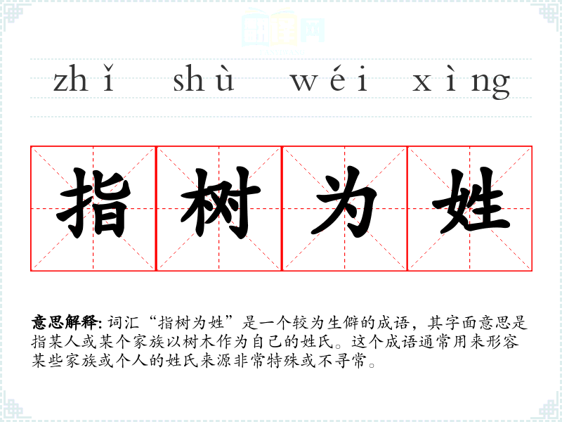 词汇“指树为姓”是一个较为生僻的成语,其字面意思是指某人或某个家族以树木作为自己的姓氏。这个成语通常用来形容某些家族或个人的姓氏来源非常特殊或不寻常。