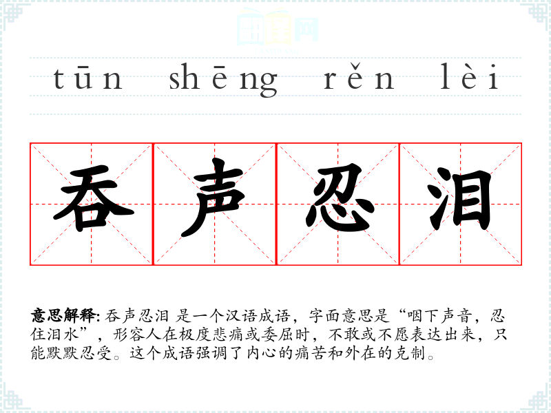吞声忍泪 是一个汉语成语,字面意思是“咽下声音,忍住泪水”,形容人在极度悲痛或委屈时,不敢或不愿表达出来,只能默默忍受。这个成语强调了内心的痛苦和外在的克制。