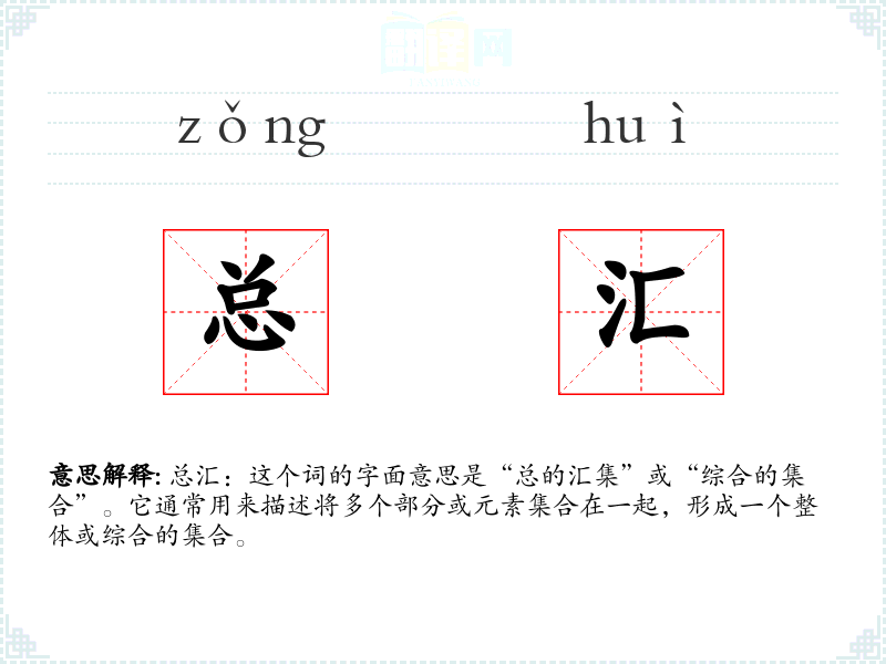 总汇:这个词的字面意思是“总的汇集”或“综合的集合”。它通常用来描述将多个部分或元素集合在一起,形成一个整体或综合的集合。