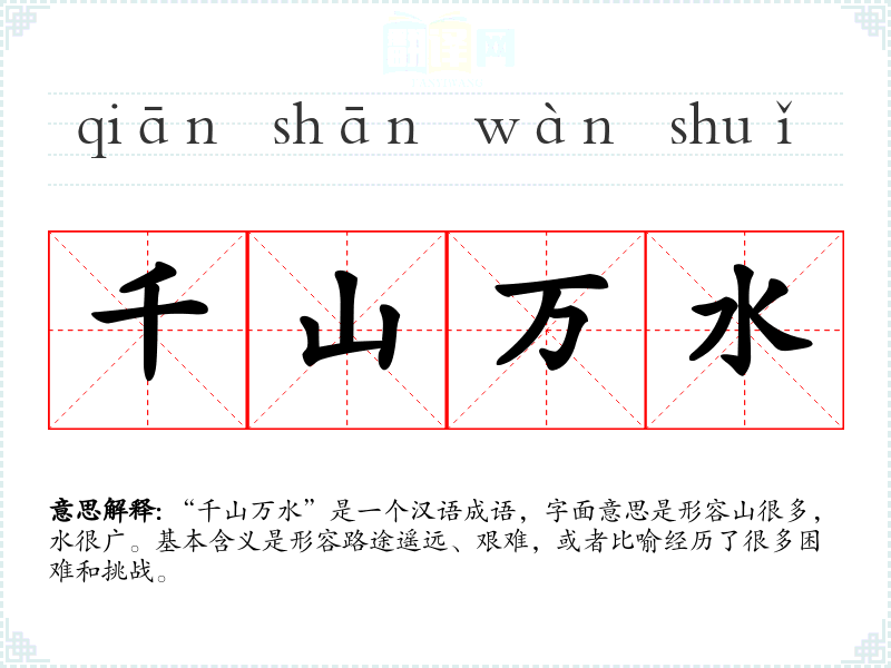 “千山万水”是一个汉语成语,字面意思是形容山很多,水很广。基本含义是形容路途遥远、艰难,或者比喻经历了很多困难和挑战。