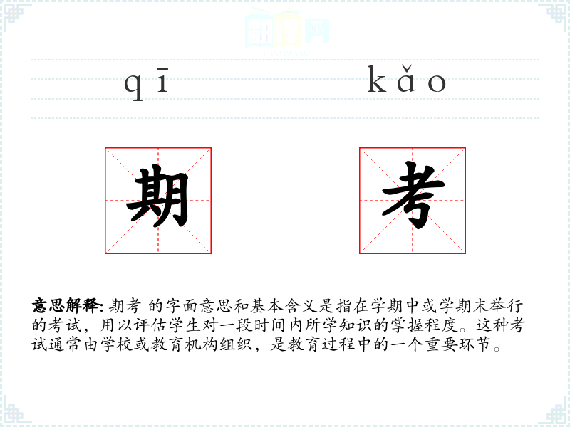 期考 的字面意思和基本含义是指在学期中或学期末举行的考试,用以评估学生对一段时间内所学知识的掌握程度。这种考试通常由学校或教育机构组织,是教育过程中的一个重要环节。