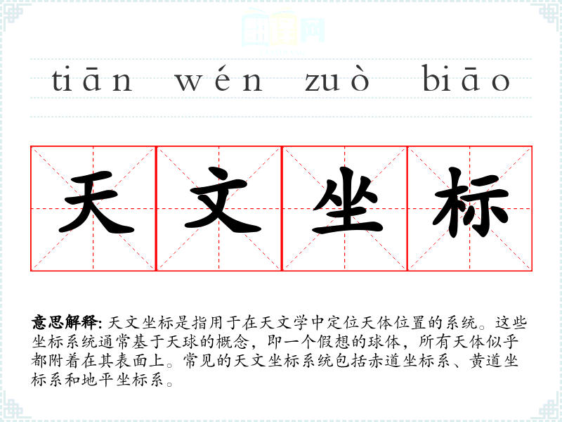 - 反义词:地理坐标(用于地球上的位置定位,与天文坐标相对)