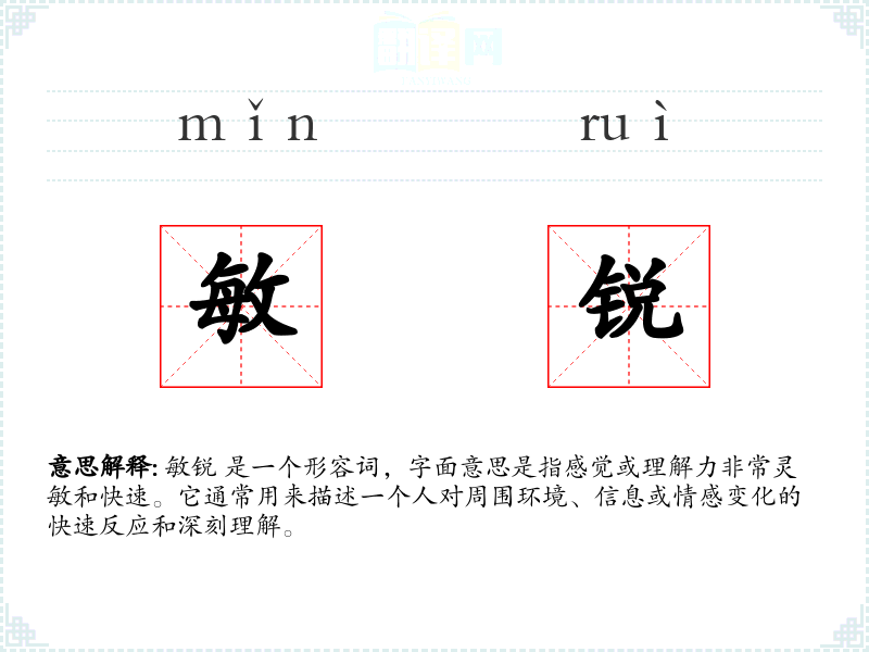 敏锐 是一个形容词,字面意思是指感觉或理解力非常灵敏和快速。它通常用来描述一个人对周围环境、信息或情感变化的快速反应和深刻理解。