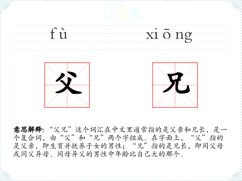 “父兄”这个词汇在中文里通常指的是父亲和兄长,是一个复合词,由“父”和“兄”两个字组成。在字面上,“父”指的是父亲,即生育并抚养子女的男性;“兄”指的是兄长,即同父母或同父异母、同母异父的男性中年龄比自己大的那个。
