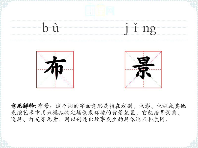 布景:这个词的字面意思是指在戏剧、电影、电视或其他表演艺术中用来模拟特定场景或环境的背景装置。它包括背景画、道具、灯光等元素,用以创造出故事发生的具体地点和氛围。