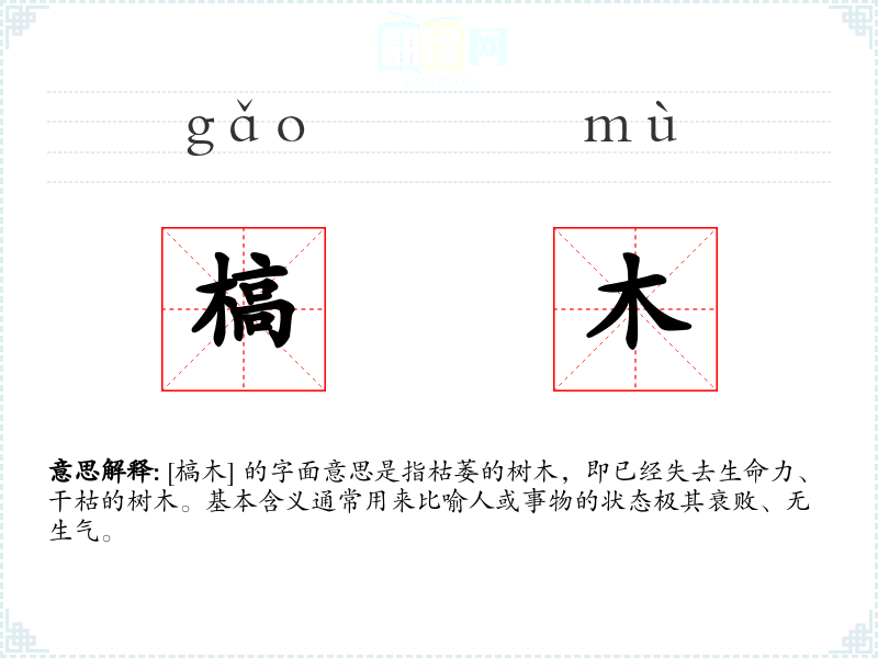 [槁木] 的字面意思是指枯萎的树木,即已经失去生命力、干枯的树木。基本含义通常用来比喻人或事物的状态极其衰败、无生气。