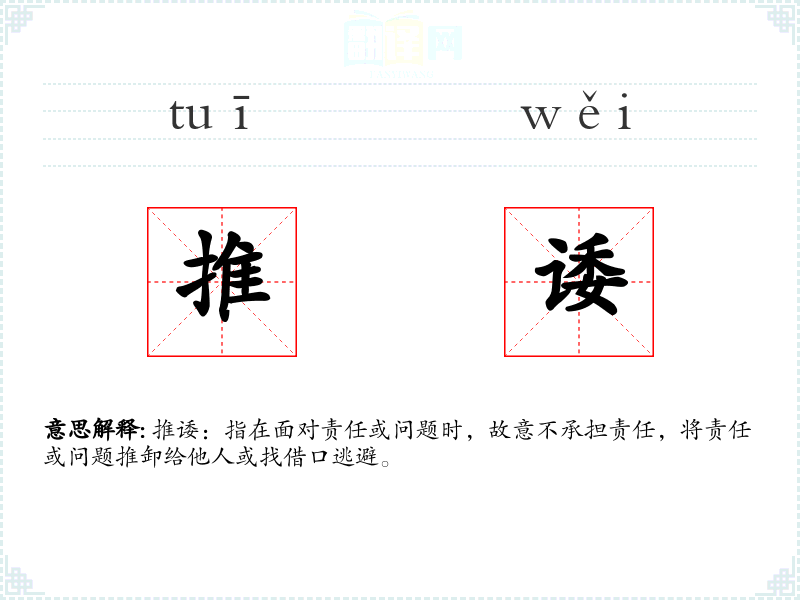 推诿:指在面对责任或问题时,故意不承担责任,将责任或问题推卸给他人或找借口逃避。