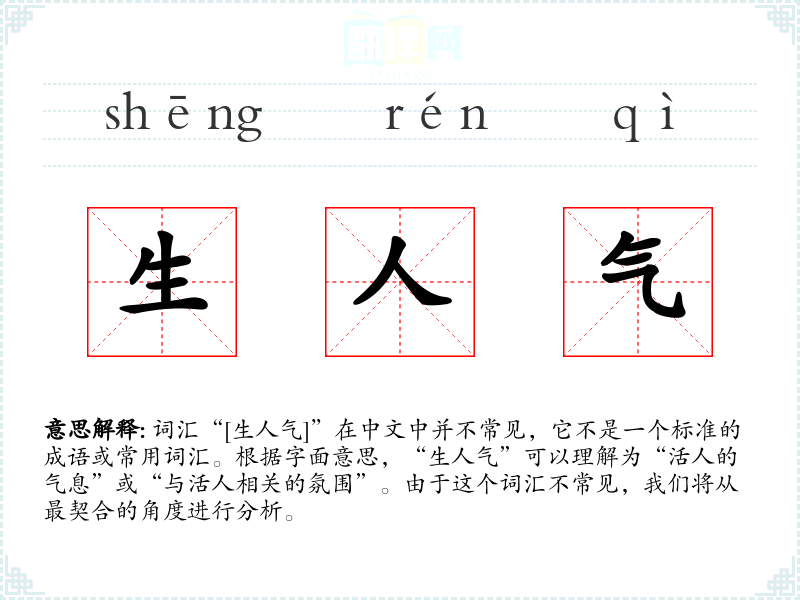 词汇“[生人气]”在中文中并不常见,它不是一个标准的成语或常用词汇。根据字面意思,“生人气”可以理解为“活人的气息”或“与活人相关的氛围”。由于这个词汇不常见,我们将从最契合的角度进行分析。