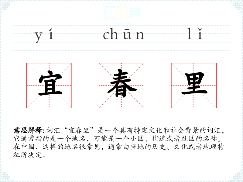 “宜春里”字面意思可以理解为“适宜居住的春天之地”,其中“宜”表示适宜,“春”代表春天,而“里”在古代汉语中指居民区,现代多用于地名后缀,表示一个较小的居住区域。