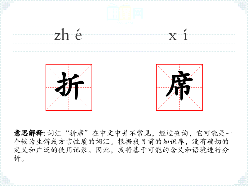 词汇“折席”在中文中并不常见,经过查询,它可能是一个较为生僻或方言性质的词汇。根据我目前的知识库,没有确切的定义和广泛的使用记录。因此,我将基于可能的含义和语境进行分析。