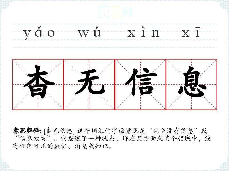 [杳无信息] 这个词汇的字面意思是“完全没有信息”或“信息缺失”。它描述了一种状态,即在某方面或某个领域中,没有任何可用的数据、消息或知识。