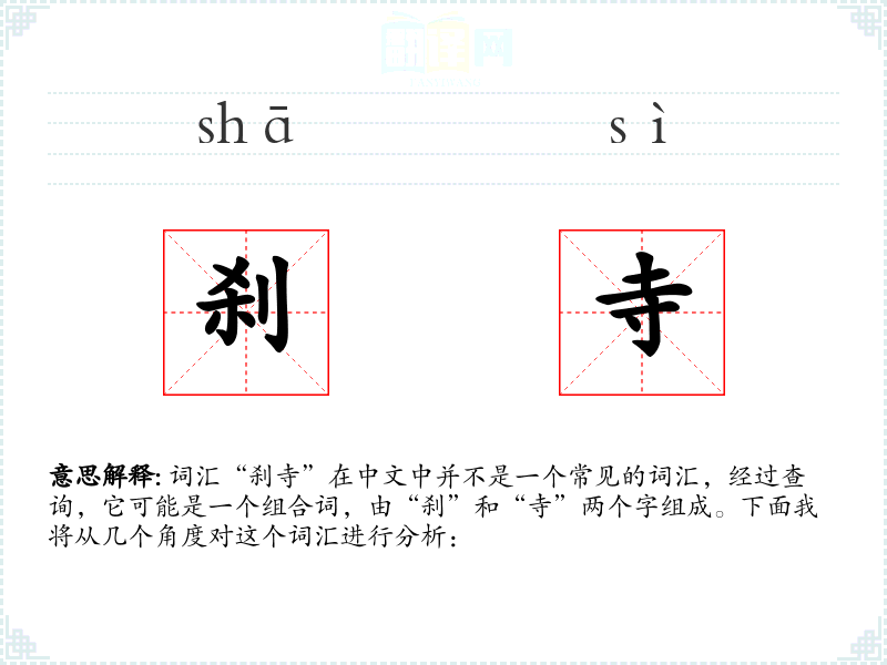 词汇“刹寺”在中文中并不是一个常见的词汇,经过查询,它可能是一个组合词,由“刹”和“寺”两个字组成。下面我将从几个角度对这个词汇进行分析: