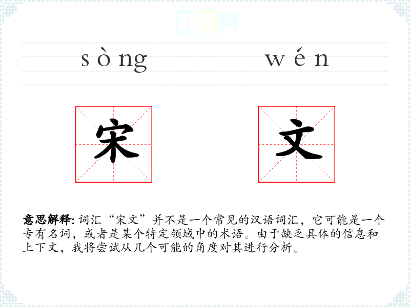 词汇“宋文”并不是一个常见的汉语词汇,它可能是一个专有名词,或者是某个特定领域中的术语。由于缺乏具体的信息和上下文,我将尝试从几个可能的角度对其进行分析。