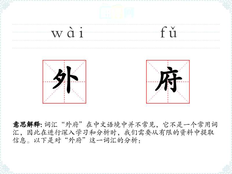 词汇“外府”在中文语境中并不常见,它不是一个常用词汇,因此在进行深入学*和分析时,我们需要从有限的资料中提取信息。以下是对“外府”这一词汇的分析: