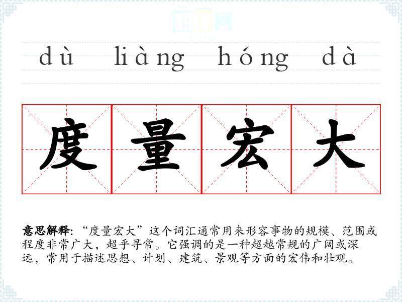 “度量”一词源自古代汉语,原指测量和计算,后来引申为衡量事物的标准或尺度。“宏大”则直接表达了广大和伟大的意思。两者结合,形成了形容事物规模或程度的词汇。