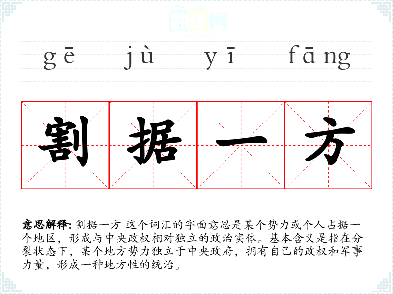 割据一方 这个词汇的字面意思是某个势力或个人占据一个地区,形成与中央政权相对独立的政治实体。基本含义是指在分裂状态下,某个地方势力独立于中央政府,拥有自己的政权和军事力量,形成一种地方性的统治。