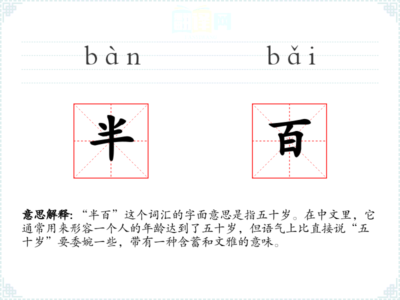 “半百”这个词汇的字面意思是指五十岁。在中文里,它通常用来形容一个人的年龄达到了五十岁,但语气上比直接说“五十岁”要委婉一些,带有一种含蓄和文雅的意味。