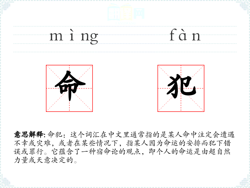 命犯:这个词汇在中文里通常指的是某人命中注定会遭遇不幸或灾难,或者在某些情况下,指某人因为命运的安排而犯下错误或罪行。它蕴含了一种宿命论的观点,即个人的命运是由超自然力量或天意决定的。