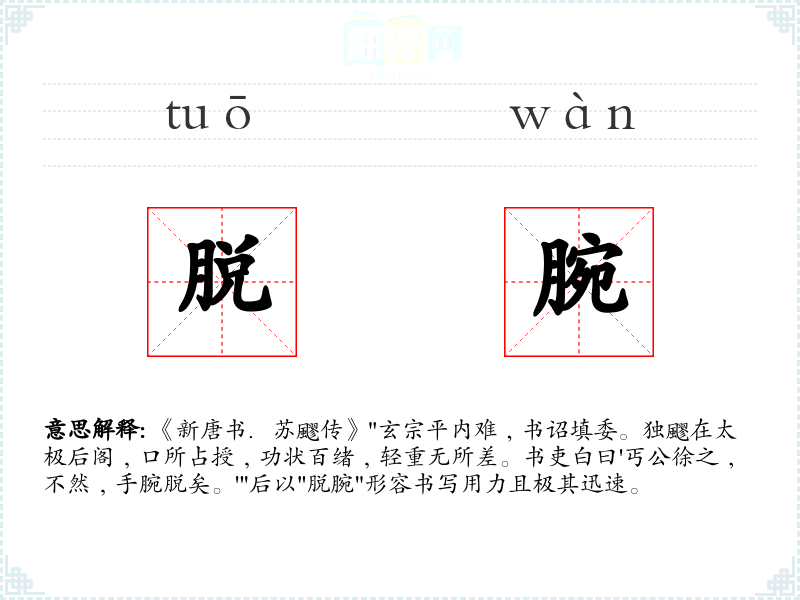 《新唐书.苏飂传》"玄宗平内难﹐书诏填委。独飂在太极后阁﹐口所占授﹐功状百绪﹐轻重无所差。书吏白曰'丐公徐之﹐不然﹐手腕脱矣。'"后以"脱腕"形容书写用力且极其迅速。