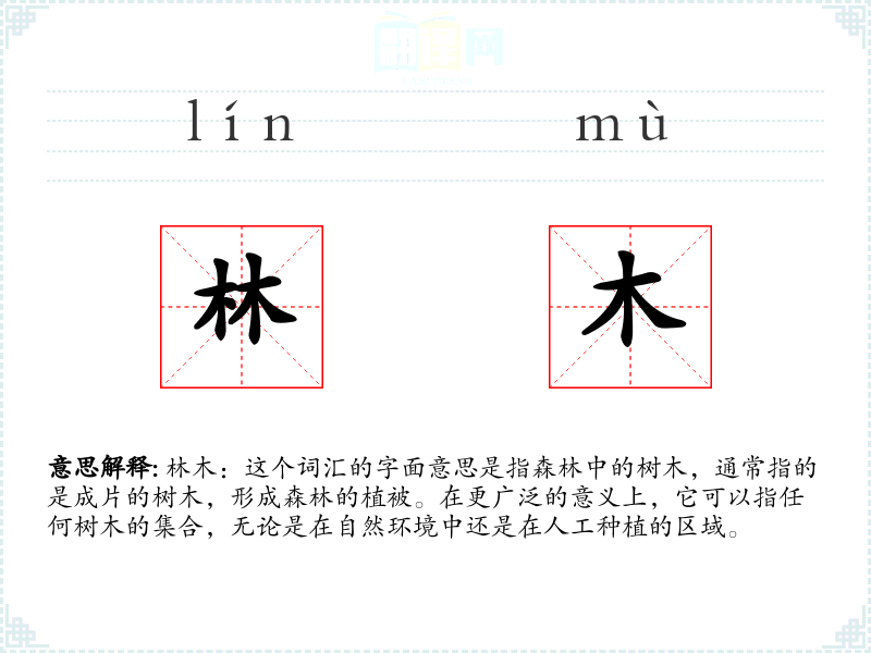 林木:这个词汇的字面意思是指森林中的树木,通常指的是成片的树木,形成森林的植被。在更广泛的意义上,它可以指任何树木的集合,无论是在自然环境中还是在人工种植的区域。