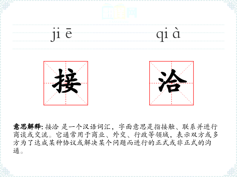 接洽 是一个汉语词汇,字面意思是指接触、联系并进行商谈或交流。它通常用于商业、外交、行政等领域,表示双方或多方为了达成某种协议或解决某个问题而进行的正式或非正式的沟通。