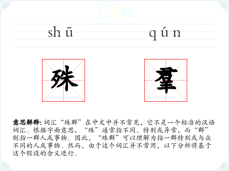 由于“殊群”不是一个常用词汇,其词源和历史演变难以追溯。它可能是由“殊”和“群”两个字组合而成的新词。