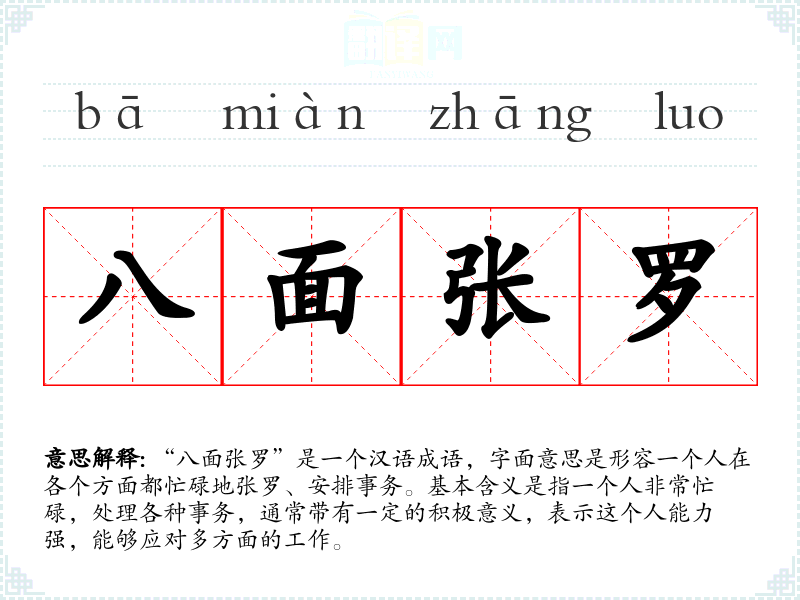 “八面张罗”是一个汉语成语,字面意思是形容一个人在各个方面都忙碌地张罗、安排事务。基本含义是指一个人非常忙碌,处理各种事务,通常带有一定的积极意义,表示这个人能力强,能够应对多方面的工作。