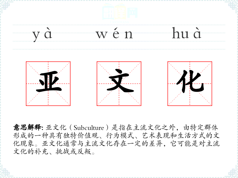 - 同义词:次文化、小众文化、边缘文化。这些词汇都强调了与主流文化的区别,但“亚文化”更侧重于其独立性和特定群体的认同。