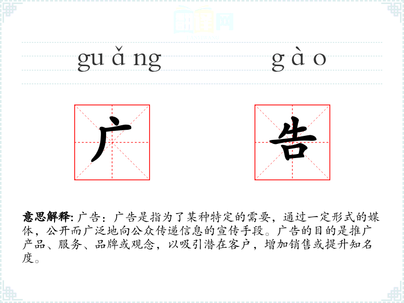 "广告"的意思解释、广告是什么意思由翻译网汉语词典查词提供。