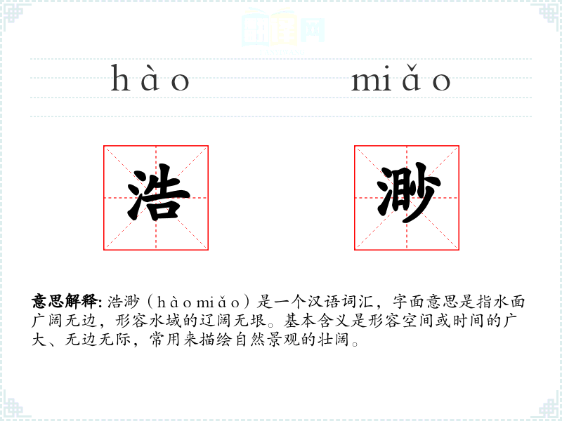 浩渺(hào miǎo)是一个汉语词汇,字面意思是指水面广阔无边,形容水域的辽阔无垠。基本含义是形容空间或时间的广大、无边无际,常用来描绘自然景观的壮阔。