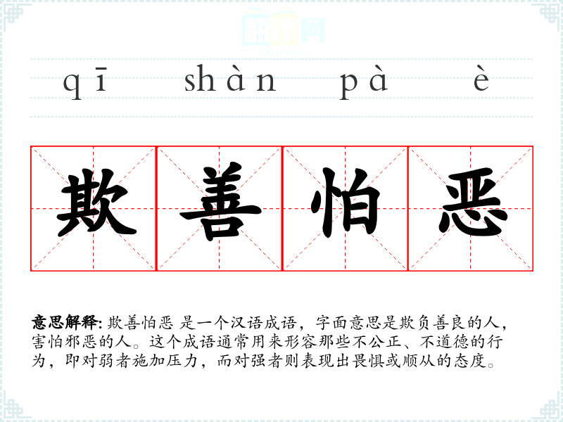 欺善怕恶 是一个汉语成语,字面意思是欺负善良的人,害怕邪恶的人。这个成语通常用来形容那些不公正、不道德的行为,即对弱者施加压力,而对强者则表现出畏惧或顺从的态度。