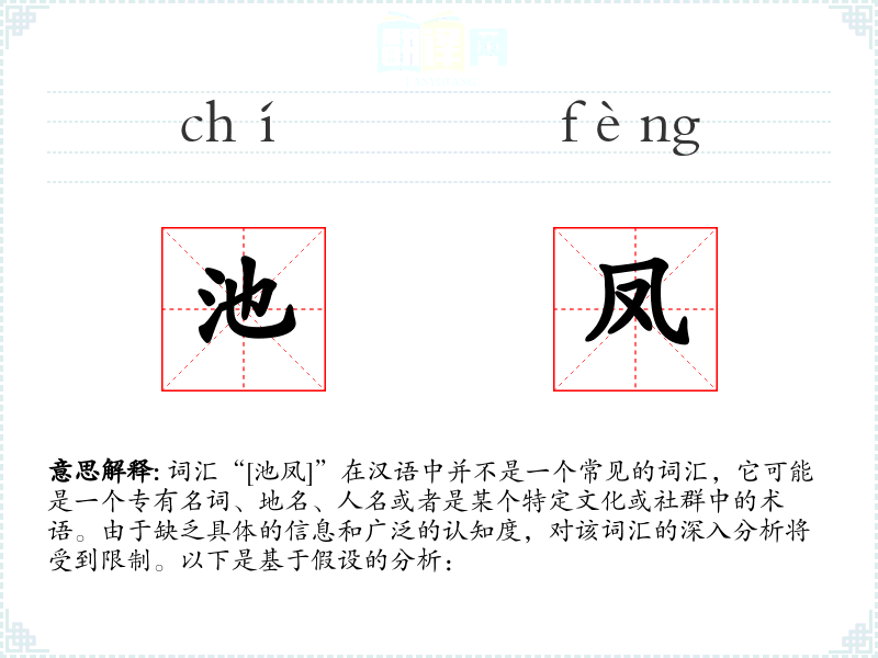 - 字面意思和基本含义:如果“池凤”是一个地名或人名,那么它的字面意思可能并不具有普遍的解释性,而是特定于某个地方或个人的标识。