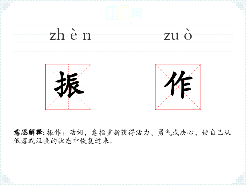 振作:动词,意指重新获得活力、勇气或决心,使自己从低落或沮丧的状态中恢复过来。