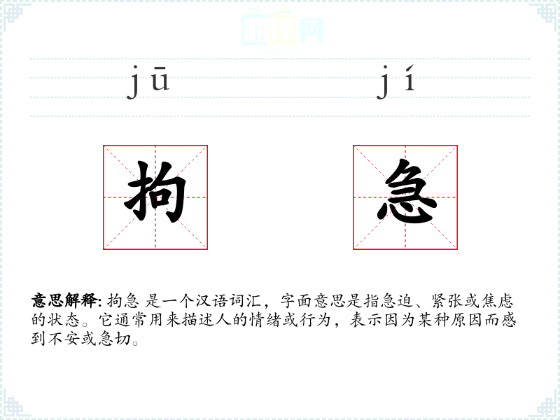 拘急 是一个汉语词汇,字面意思是指急迫、紧张或焦虑的状态。它通常用来描述人的情绪或行为,表示因为某种原因而感到不安或急切。