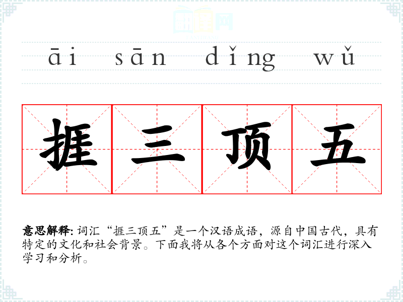 词汇“捱三顶五”是一个汉语成语,源自*古代,具有特定的文化和社会背景。下面我将从各个方面对这个词汇进行深入学和分析。
