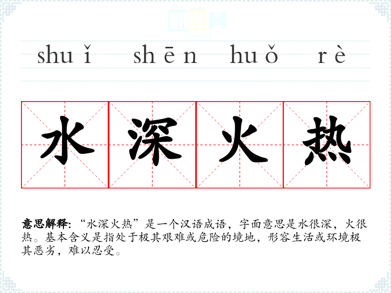“水深火热”是一个汉语成语,字面意思是水很深,火很热。基本含义是指处于极其艰难或危险的境地,形容生活或环境极其恶劣,难以忍受。