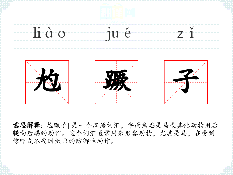 [尥蹶子] 是一个汉语词汇,字面意思是马或其他动物用后腿向后踢的动作。这个词汇通常用来形容动物,尤其是马,在受到惊吓或不安时做出的防御性动作。